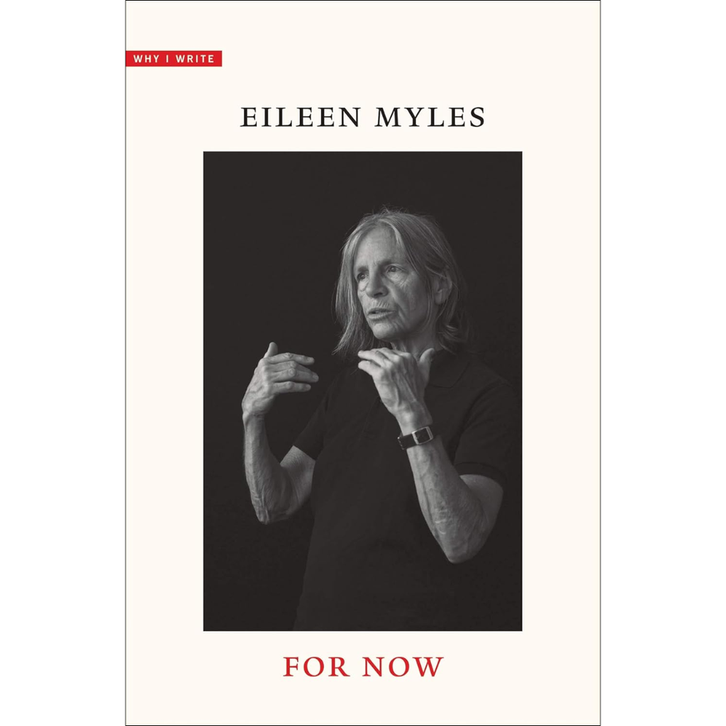 For Myles, time’s “optic quality” is what enables writing in the first place—as attention, as devotion, as excess. It is this chronologized vision that enables the writer to love the world as it presently is, lending love a linguistic permanence amid social and political systems that threaten to eradicate it. Irreverent, generous, and always insightful, For Now is a candid record of the creative process from one of our most beloved artists.